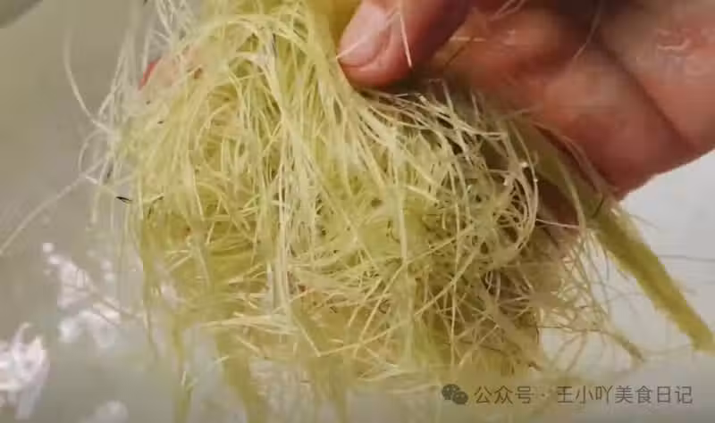 將洗凈的玉米須從清水中撈出來,放入一個漏網或者乾淨的紗布中,用力擠干其中的水分。擠干水分這一步很重要,因為如果玉米須帶有過多的水分,會影響後續與陳醋的融合效果,也可能導致浸泡過程中出現變質的情況。擠干水分後的玉米須呈現出一種乾燥、輕盈的狀態。