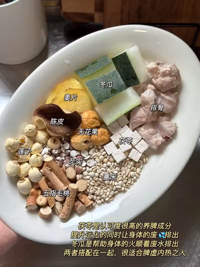 材料: 五指毛桃20g、薏米15g、芡實10g、蓮子10g、茯苓10g、陳皮1瓣、無花果3顆、冬瓜、排骨