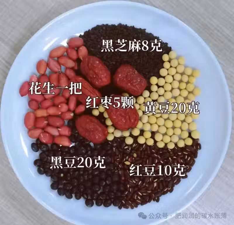 食材:黃豆20克、黑豆20克、黑芝麻8克、花生一把、紅棗5顆、紅豆10克