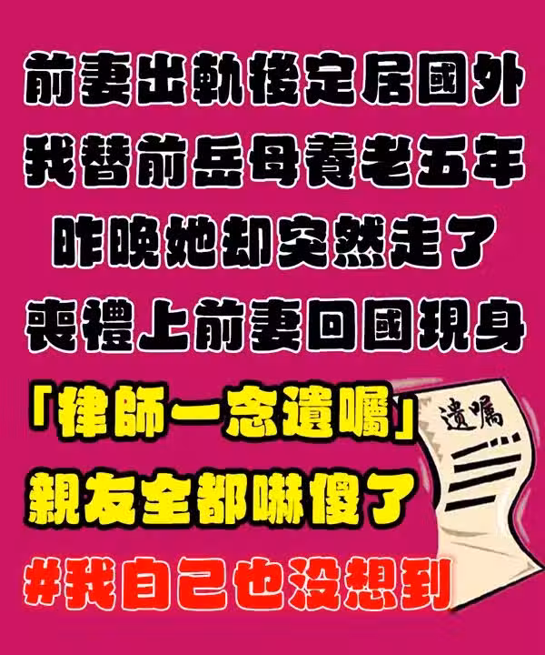 前妻出軌後定居國外,我替前岳母養老五年,昨晚她卻突然走了....喪禮上前妻回國現身「律師一念遺囑」親友全傻了 #我自己也沒想到