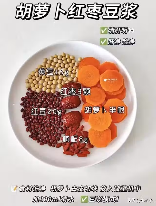 食材:胡蘿蔔半根+紅豆20g+黃豆15g+枸杞8g+紅棗3顆。
