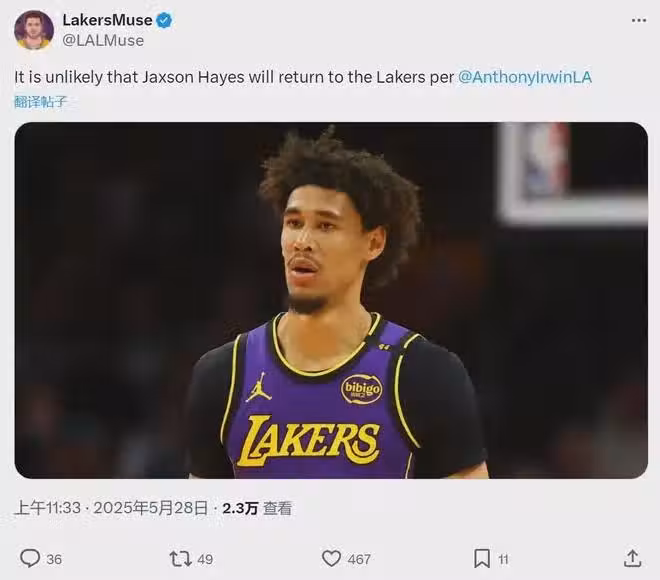 據湖人隨隊記者Anthony F. Irwin報道,亞歷克斯-萊恩的湖人生涯結束,下賽季不會回歸球隊。此外,賈克森-海斯回歸湖人的希望非常渺茫。海斯對季後賽上場時間不滿,認為湖人影響了他的下一份合同,湖人也不想給他續約合同!