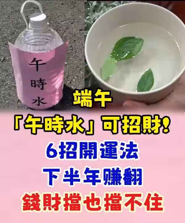 命理專家楊登嵙指出,端午節當天中午11-13點在湧泉、瀑布、井裡或家裡水龍頭接存起來的水,稱為「午時水」,又稱「純陽水」,若能在這時間將此水置於陽光下曝曬至少30分鐘,吸收陽光的正陽能量更好,至陽至剛。