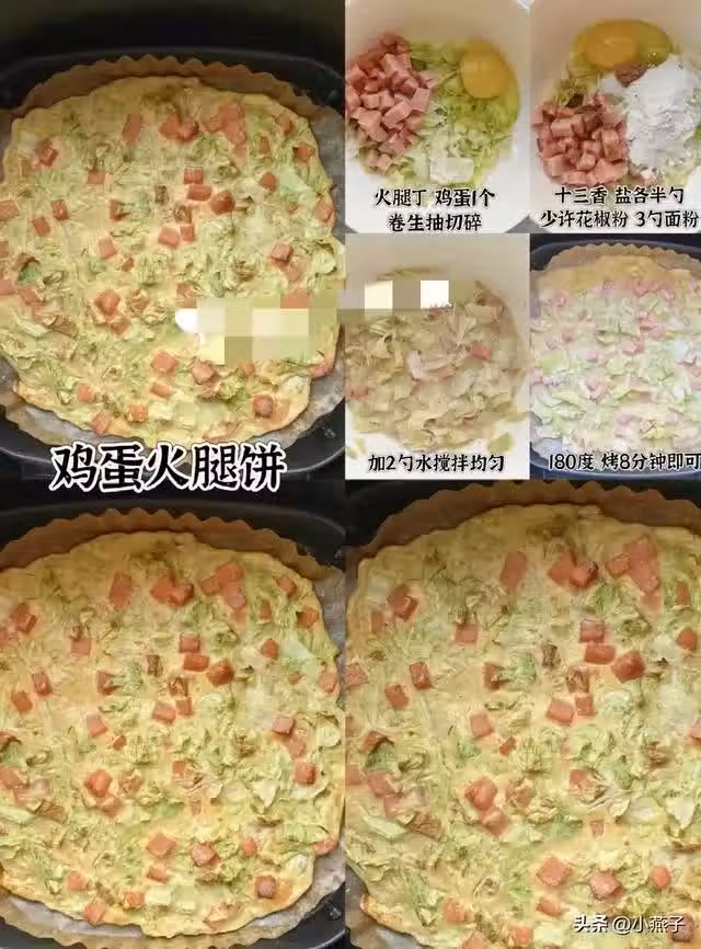 食材:火腿丁50g+雞蛋1個+麵粉3勺+生抽/花椒粉少許。