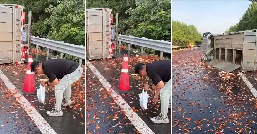 貨車高速公路上翻車,車廂內貨物「灑落行車道」,路人細看後驚恐:竟都是活物!
