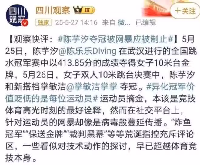 由於全紅嬋退賽,陳芋汐和掌敏潔在這次全國跳水冠軍賽中組成新的搭檔,並且拿到了雙金的好成績,可是除了鮮花和掌聲之外,一些不好聲音也在發酵。