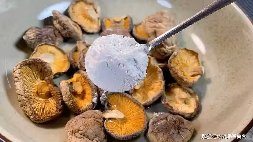 【食材準備】:干香菇60-80克、澱粉15克、小蘇打5克、白砂糖5克、溫水適量(40攝氏度)。