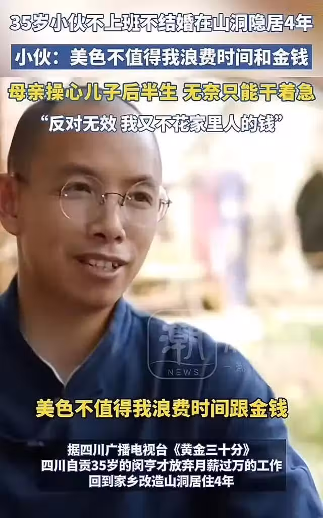 近日,一名35歲男子不上班、也不結婚,隱居在山洞4年了,這可讓他的母親擔心死了,畢竟35歲老大不小,再不結婚就老了。可是男子想得通透,任誰也勸不動,他坦言:「美色不值得浪費錢!」結果他的母親也只能幹著急,到底怎麼回事?一起來看看!