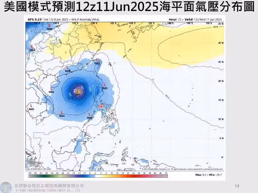 准颱風北上,水汽直衝台灣,預測嘉義縣、嘉義市、台南、高雄、屏東5縣市下雨!賈新興表示,台灣、中國南邊都在低氣壓範圍內,周五(13)至周日(15)受西南水汽移入影響,導致午後雷陣雨較大,其中嘉義以南於深夜至隔天早上易有局部短暫雨,午後各地有局部短暫陣雨;下周一(16)清晨,台中以南有局部短暫雨,午後各地有局部短暫陣雨;下周二(17)午後,各地山區、宜蘭有零星短暫陣雨。