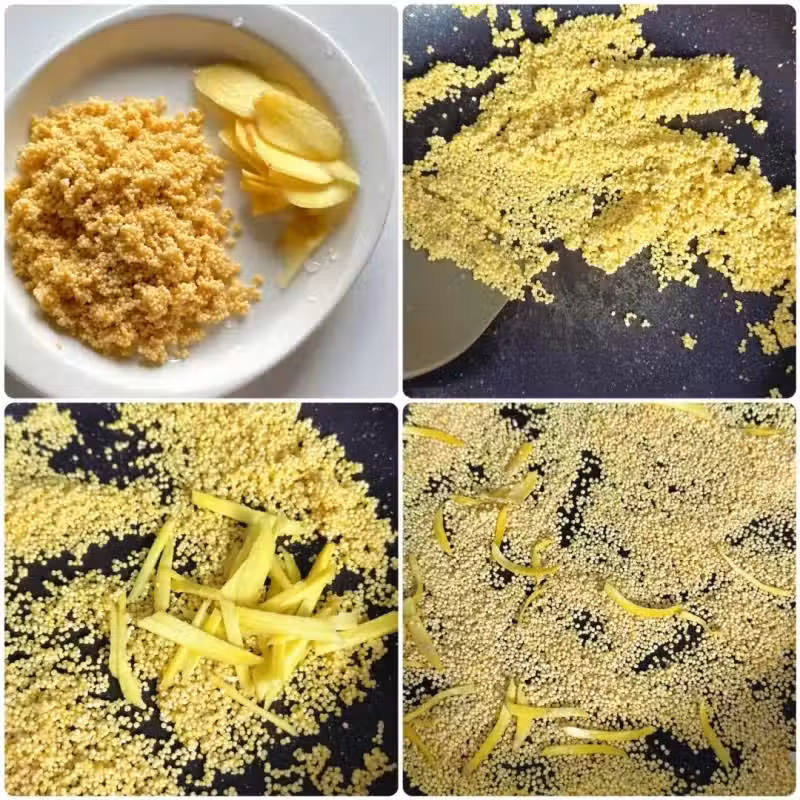 1. 小米稍微沖洗一下,瀝干水分(不用完全乾透),鍋燒熱(不放油!),倒入小米,中小火不停翻炒,炒到米粒變干、顏色微微發黃,能聞到米香就行。