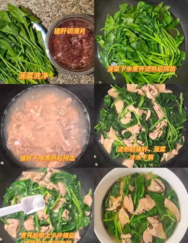 ⑥將焯水後的菠菜放入豬肝湯里,小火慢煮15分鐘。