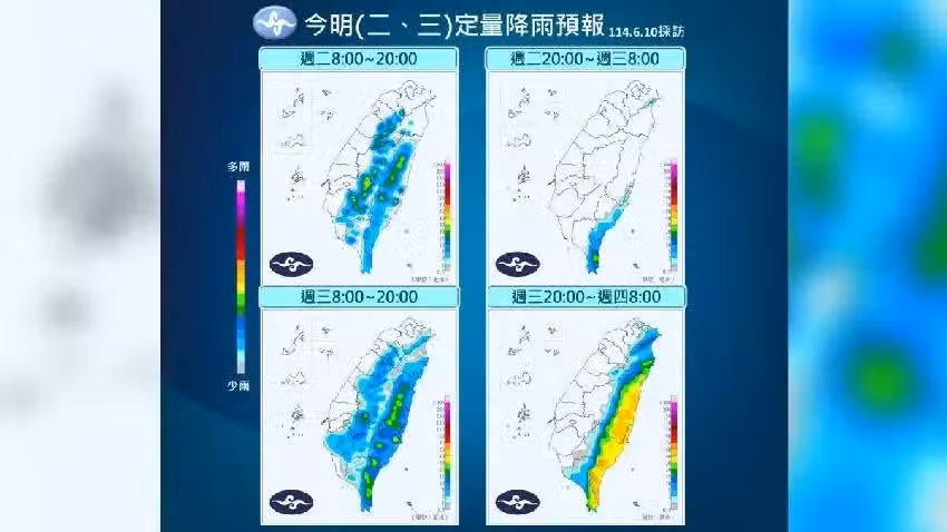 周三東半部地區及恆春半島有局部短暫陣雨,雨勢愈晚愈明顯,其他地區為多雲到晴,午後中南部地區及其他山區有局部短暫雷陣雨。