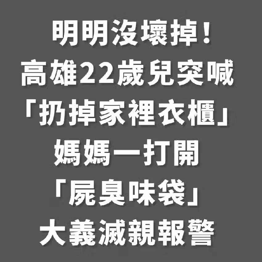 明明沒壞掉!高雄22歲兒突喊「扔掉家裡衣櫃...」,媽媽一打開「屍臭味袋」 大義滅親報警