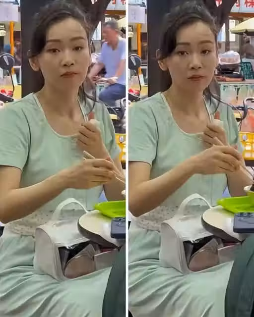 視訊中的思琪妹坐在一檔街邊檔的桌前用餐,穿著短袖長裙搭配厚底運動鞋,扎著簡單的馬尾,打扮休閒。