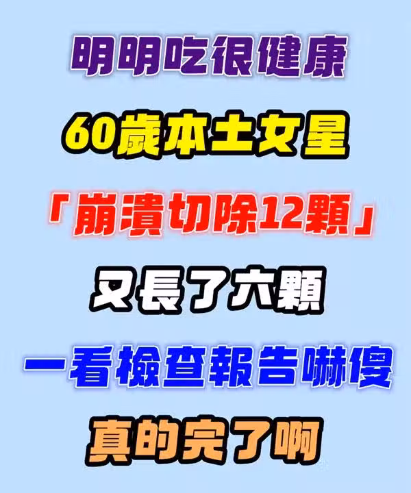 明明吃很健康!60歲本土女星「崩潰切除12顆」又長六顆,她「一看檢查報告」嚇傻:真的完了