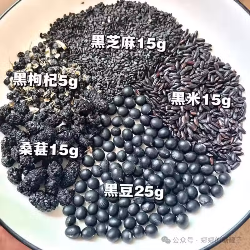 食材:黑豆25g、黑米15g、黑芝麻15g、桑葚15g、黑枸杞5g。