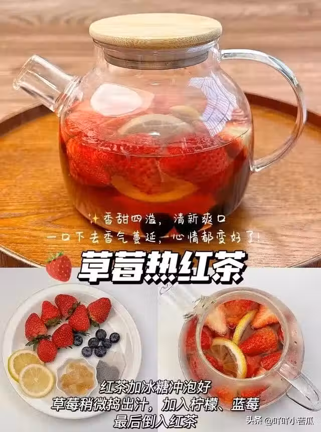 做法:紅茶+冰糖泡開,草莓壓出汁+檸檬片+藍莓,倒入紅茶。