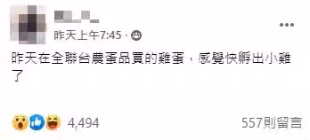 一名網友在臉書「爆怨公社」表示,自己到全聯買雞蛋,回家打碎後發現,裡面的蛋白竟呈現鮮紅色,上面還帶有血塊,讓他嚇到直呼,「感覺快孵出小雞了」!