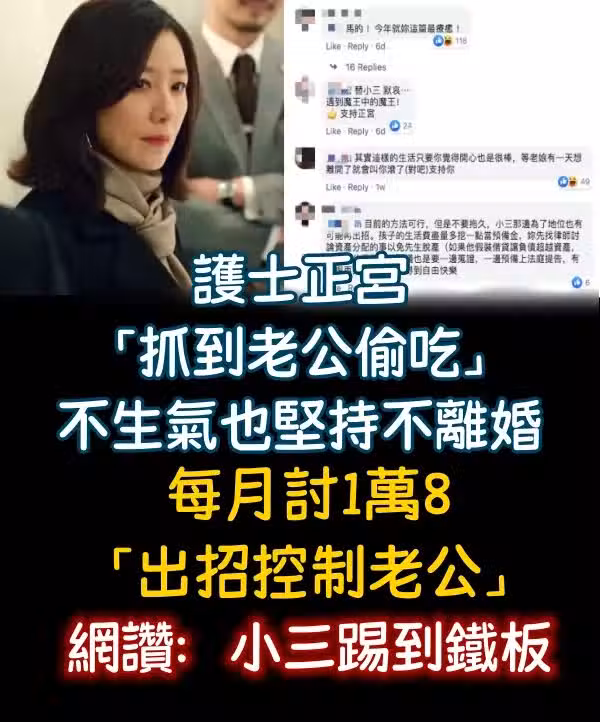 護士正宮「抓到老公偷.吃」不生氣也堅持不離婚 每月討1萬8「出招控制老公」網贊:小三踢到鐵板