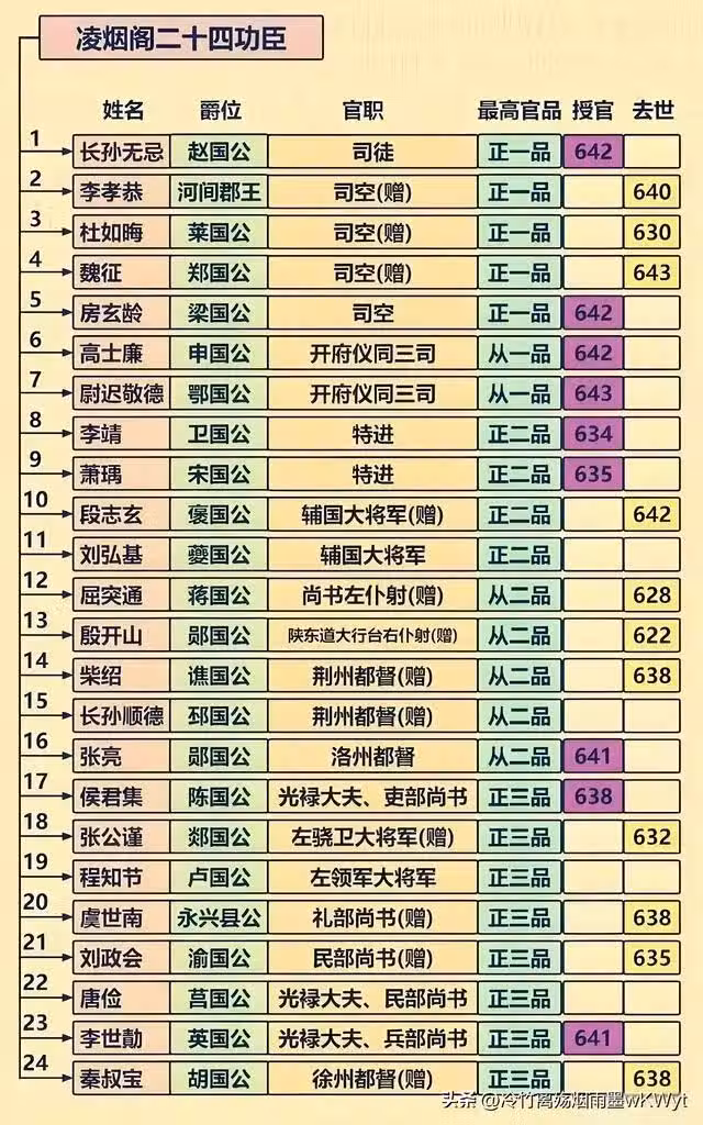 5、房玄齡(梁國公,官職:司空):位列第五。房玄齡善於謀劃,長期擔任宰相,是貞觀政壇的核心人物。圖表中其授司空官職年份為642年。在凌煙閣畫像時,房玄齡尚在世。
