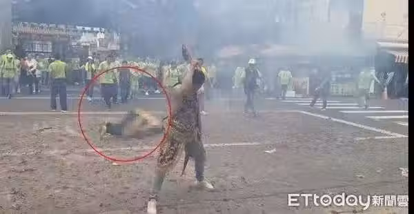 從現場錄影畫面顯示,當時剛放完鞭炮,現場白煙密布,而李男與另一名乩身前後分立,手持令旗、法器,威風凜凜。