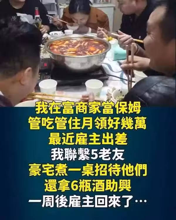 我在富商家當保姆,管吃管住月領好幾萬,最近僱主出差,我聯繫5老友、豪宅煮一桌招待他們,還拿6瓶酒助興,一周後僱主回來了....