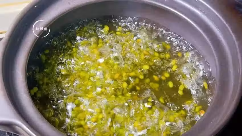 第四步:鍋中放入適量水,將水煮沸後,把凍好的綠豆全部放入鍋中,大火煮一會兒,直到綠豆有一點點開花就可以了。