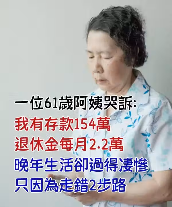 一位61歲阿姨哭訴:我有存款154萬,退休金每月2.2萬,晚年生活卻過得悽慘,只因為走錯2步路