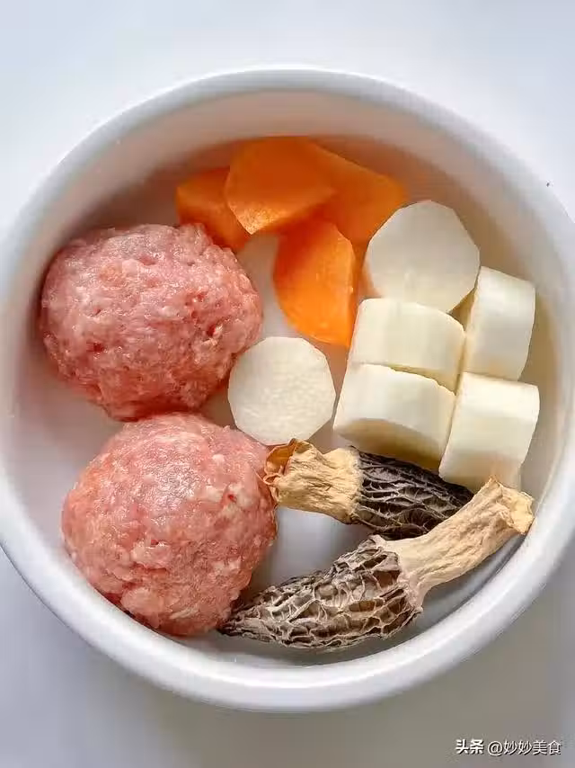 將鮮嫩肉末加澱粉、薑絲等腌制,整成丸子。羊肚菌提前泡發10分鐘,再與胡蘿蔔、山藥等食材一同入碗,倒入泡菌水,冷水上鍋慢蒸。25分鐘後,鮮香滋補的湯就出鍋啦!