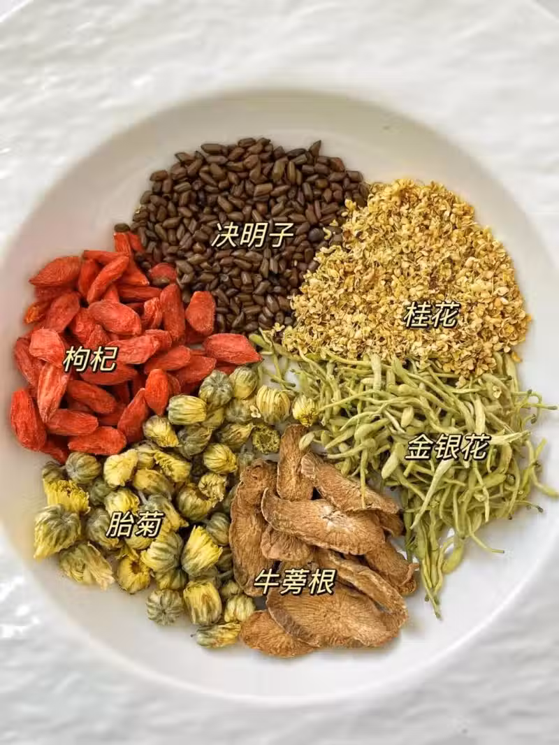 金銀花2g|牛蒡根3片|菊花10朵|桂花2g|決明子4g|枸杞10顆