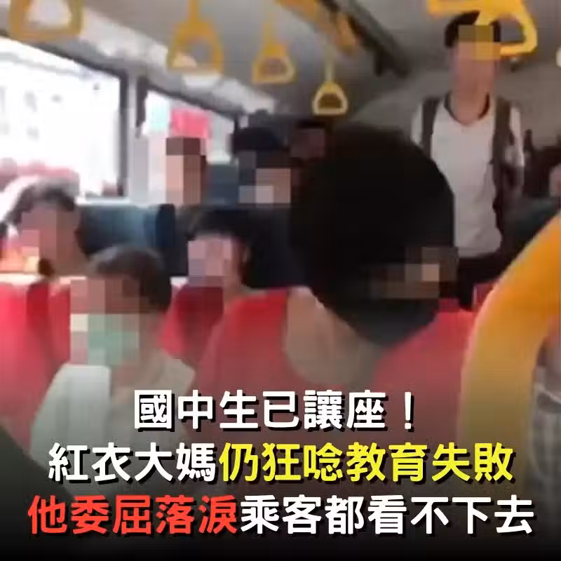 搭公車國中生已讓座!紅衣大媽狂碎念「教育失敗」他一旁委屈哭 影片曝光網炸鍋:她才該被教育