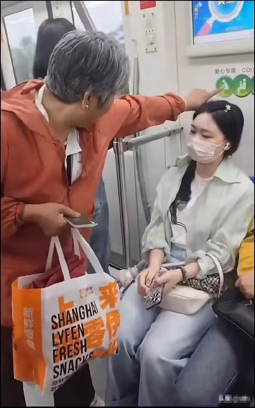 大媽的眼神頭頂了一個坐在愛心專座上的年輕女子身上。