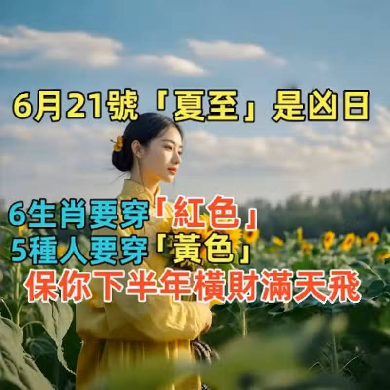 6月21號「夏至」是凶日,6生肖要穿「紅色」,5種人要穿「黃色」,保你下半年橫財滿天飛