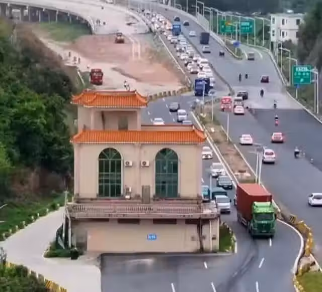 如今,小樓所在的區域成為了一處奇景:它被左右兩邊的馬路包圍,只剩兩米寬的孤角突兀地立在道路正中。