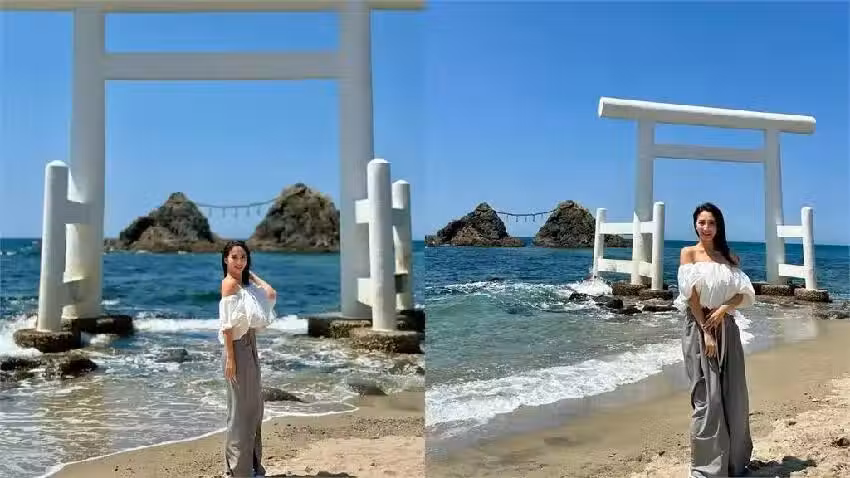 而林采緹也積極經營社群,近日就在臉書曬出旅遊福岡的照片,造訪當地景點「櫻井夫婦岩」,她穿著白色一字領上衣站在純白鳥居前,露出香肩與鎖骨,搭配「海上鳥居+晴朗藍天」的背景,美照吸引粉絲熱烈回應,形象也從性感辣妹蛻變為優雅斜槓代表。