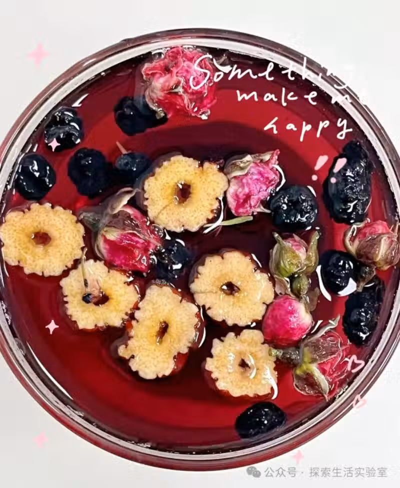 2️⃣水溫別太高,80度左右最好,先放玫瑰和桑葚,燜3分鐘再放黑枸杞,不然花青素會流失;