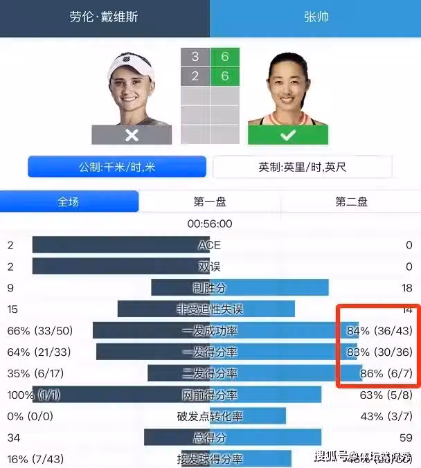 到了第二盤,比賽徹底進入到了張帥的節奏當中,比賽的轉折點是在第3局,當時40-15的戴維斯連續出現失誤,結果被張帥連得4分完成破發。接下來的戴維斯,徹底成為了陪練,張帥越打越勇,接下來的3局比賽中,她只丟了1分!