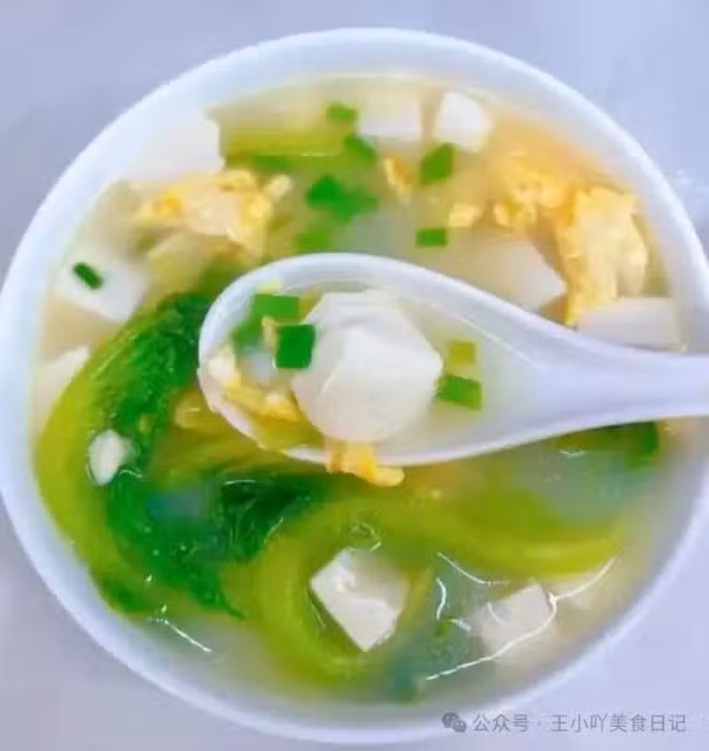 做法:豆腐切小塊、生菜洗凈,雞蛋打散備用鍋中食用油,加姜、蒜炒香,加水煮沸放入豆腐,煮至微微浮起,加入蛋液蛋花定型,加生菜,煮1分鐘,調味出鍋。
