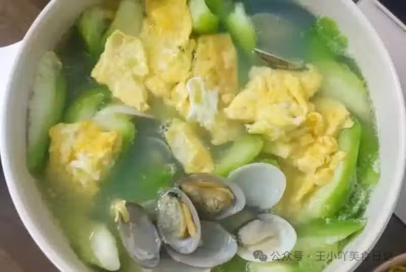 做法:絲瓜洗凈去皮切段,貽貝過水燙熟去沙備用鍋內加油,雞蛋炒定型,加入絲瓜翻炒,大火煮開貽貝入鍋,煮約15秒,調味出鍋。