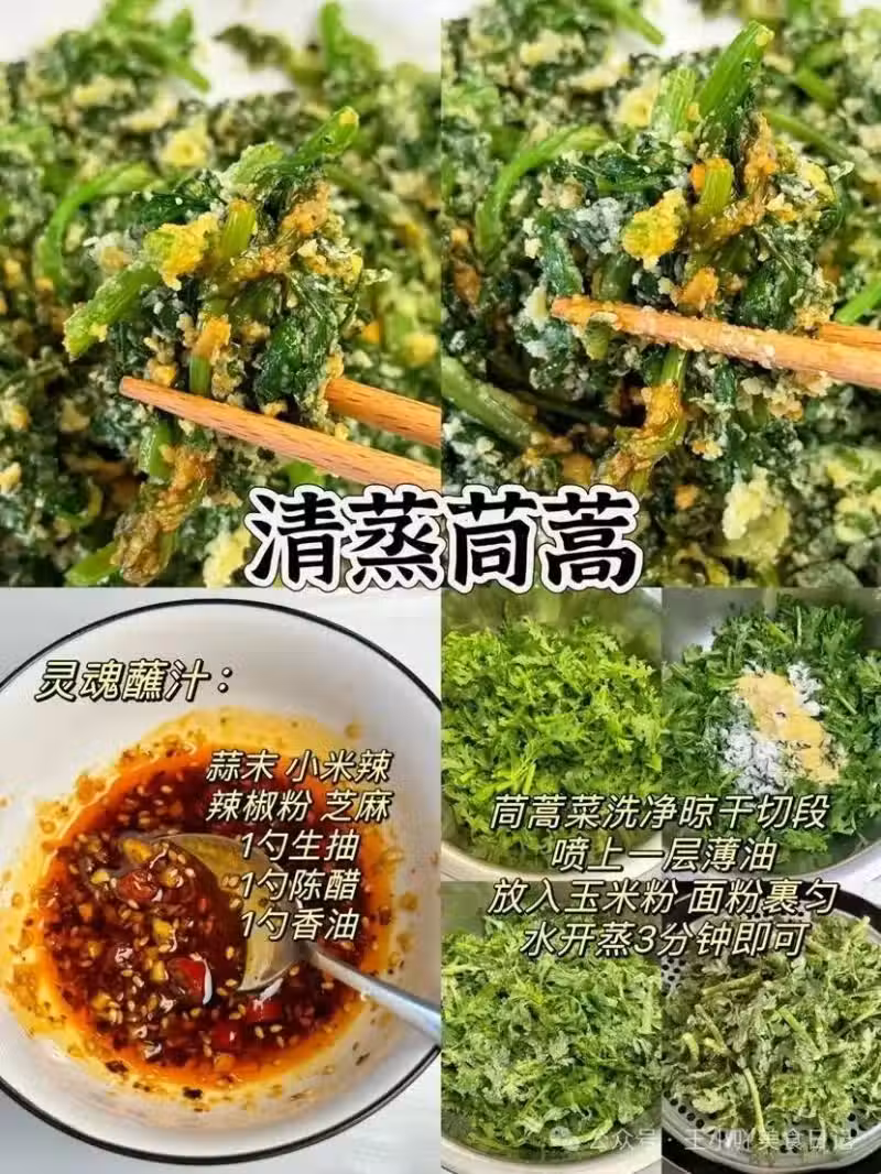 茼蒿菜洗凈,晾乾切取,噴上一層薄油,放入玉米粉,麵粉裹勻,水開蒸3分鐘即可。