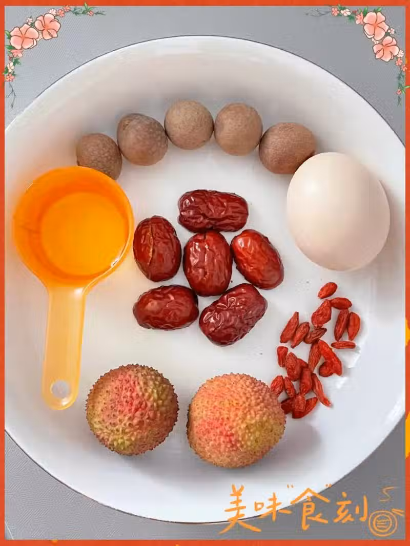 荔枝7顆、紅棗5顆、桂圓肉10克、雞蛋1個