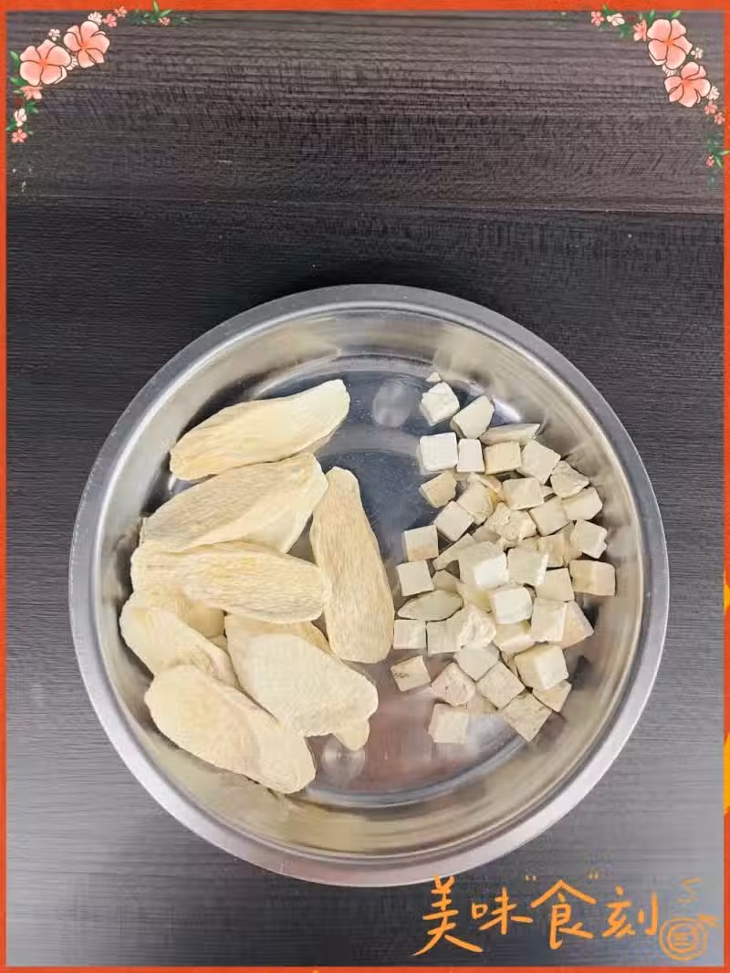 2. 茯苓山藥,提前浸泡在溫水裡半小時,泡軟後更容易煮透。