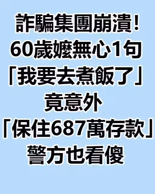 詐騙集團崩潰! 60歲嬤無心1句「我要去煮飯了」 竟意外「保住687萬存款」警方也看傻