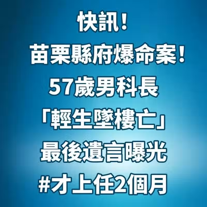 快訊/苗栗縣府爆命案!57歲男科長「輕生墜樓亡」...最後遺言曝光 #才上任2個月!