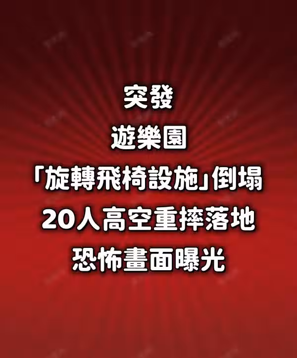 根據《社會傳真》報導,當時因不明原因,旋轉飛椅在啟動時倒塌,乘坐飛椅的遊客中還有不少孩童,大家紛紛甩飛出去,甚至摔落至地面。