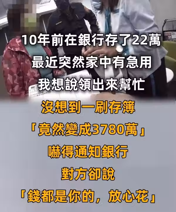 10年前在銀行存了22萬,最近突然家中有急用,我想說領出來幫忙,沒想到一刷存簿「竟然變成3780萬...」,嚇得通知銀行,對方卻說「錢都是你的,放心花」