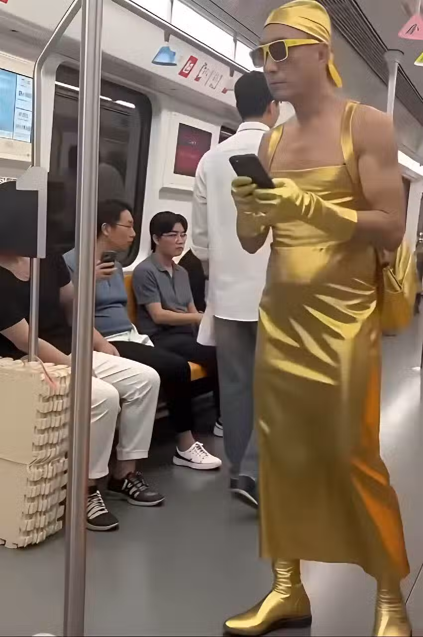 捷運上一位「金色弔帶裙大叔」超搶眼!捷運變秀場,不料仔細看去「眾人笑不出來了」