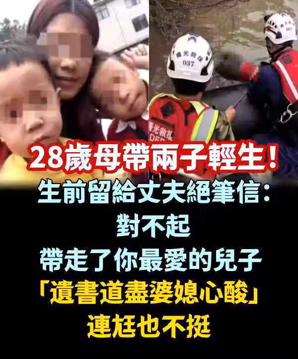 一位28歲的母親帶著兩個年紀還小的兒子無預警離家出走,沒想到等到被找到時卻為時已晚,母子三人都已回天乏術,而這名母親離開前留下了兩份遺書,內容寫道「對不起,帶走了你最愛的兒子…」