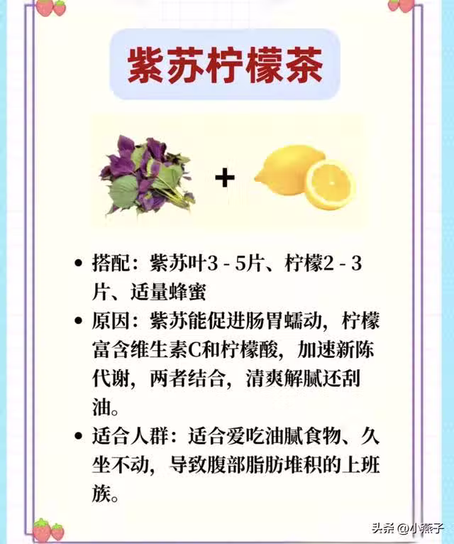 配方:紫蘇葉3片+檸檬2片+蜂蜜1勺(冷藏更佳)。