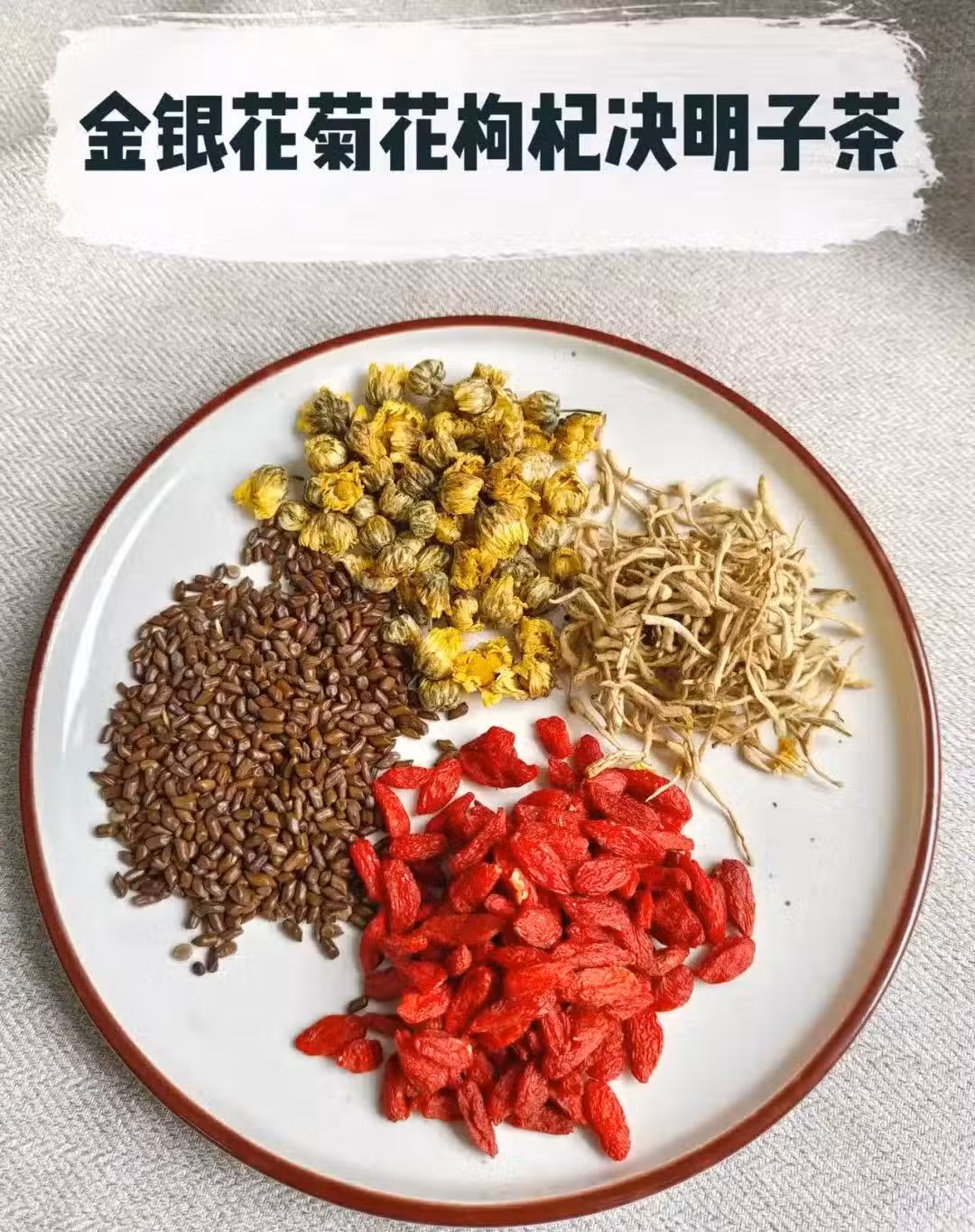 胎菊10朵、金銀花3g、炒決明子5g、枸杞15粒